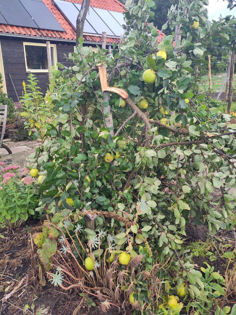 Maar dit jaar zat het boompje helemaal nokkievol met vruchten. Zou dat wel goed gaan? Nee dus. Tijdens een paar winderige dagen in september scheurde het boompje uit elkaar onder het gewicht van de vruchten.
