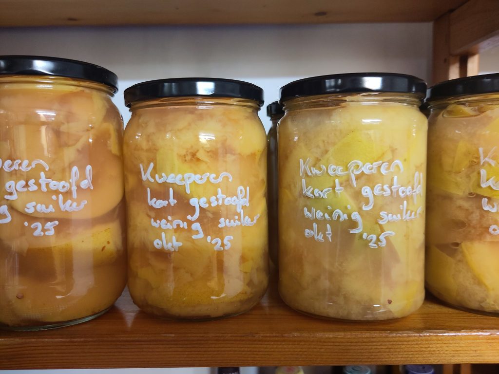 Kweeperen kan je niet rauw eten, maar kort gestoofd zijn ze heerlijk! Dus ik maak potten en potten kweeperen in. En kweeperenjam, kweeperentoetjes, kweeperentaart… Een werkelijk fantastisch kweeperenproduct is ‘ dulce de membrillo’, lang ingekookte en gedroogde kweeperenmoes. Maar daar heb ik de tijd nog niet voor gevonden.