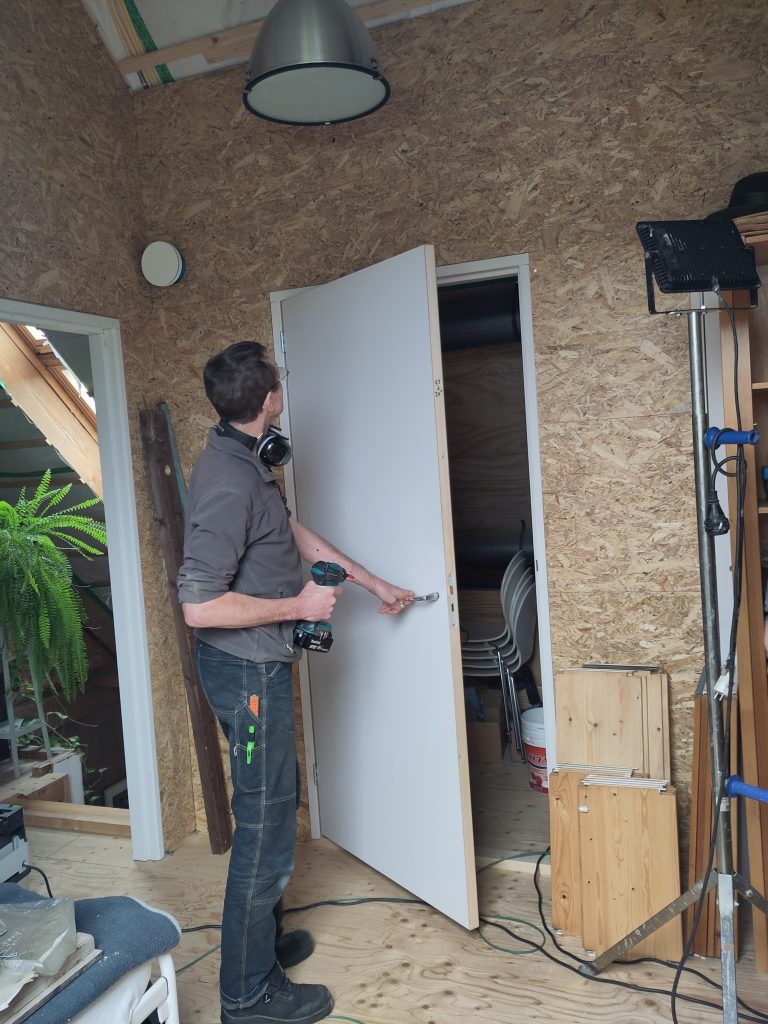 Tussen alle overige werkzaamheden door heeft Joris verder getimmerd aan wat we “de nieuwe kamer” hebben gedoopt. Een wand tussen de technische ruimte en de nieuwe kamer, mét deuren.