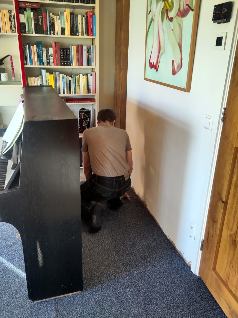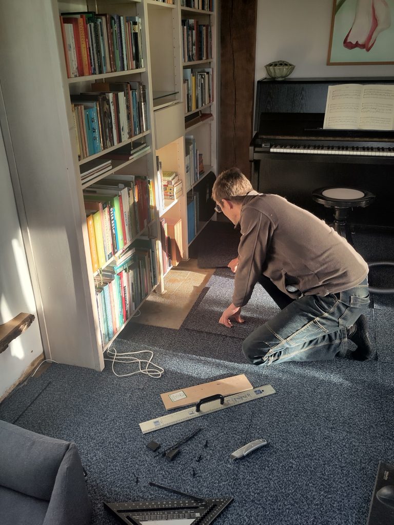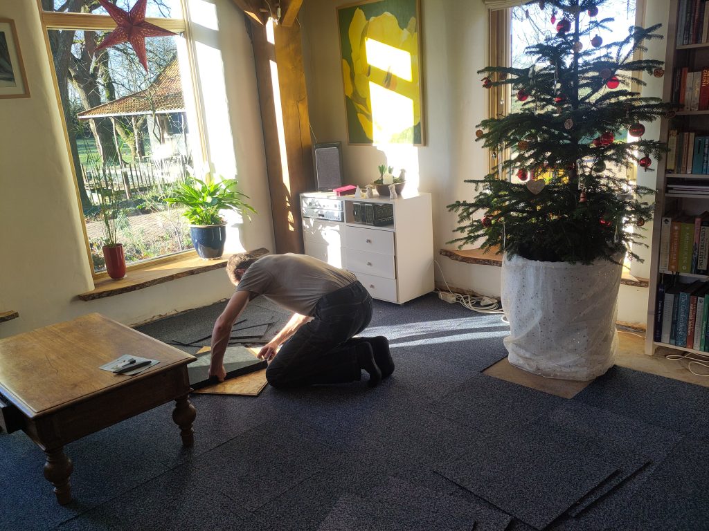 En zo hebben we nu kamerbreed studententapijt. Oppassen dat we er niet aan wennen. Een wijze buurman zei ooit “Niets is zo permanent als een tijdelijke oplossing!” Maar ik hoop nog steeds dat er vólgende winter een houten vloer ligt…