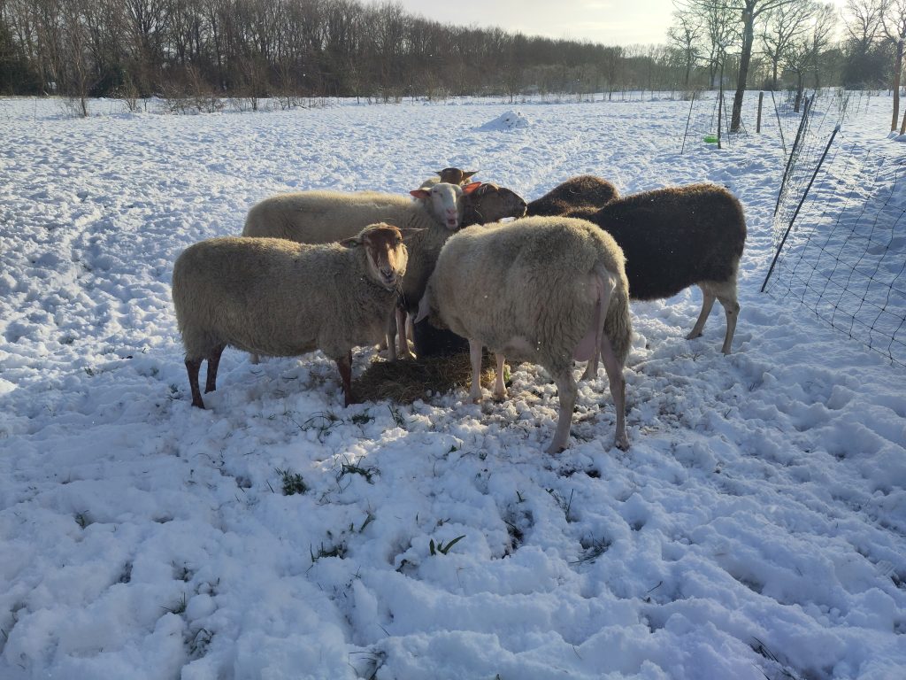 Dat zorgt voor mooie plaatjes, maar ook voor extra werk. De schapen kunnen nauwelijks grazen, ik heb ze wat hooi in de wei gebracht.
