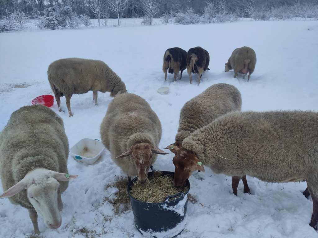 Maar nu kunnen de schapen helemaal niet meer bij het gras. Ze proberen wel wat sneeuw te eten. Maar weer hooi brengen dus. Veel extra werk…