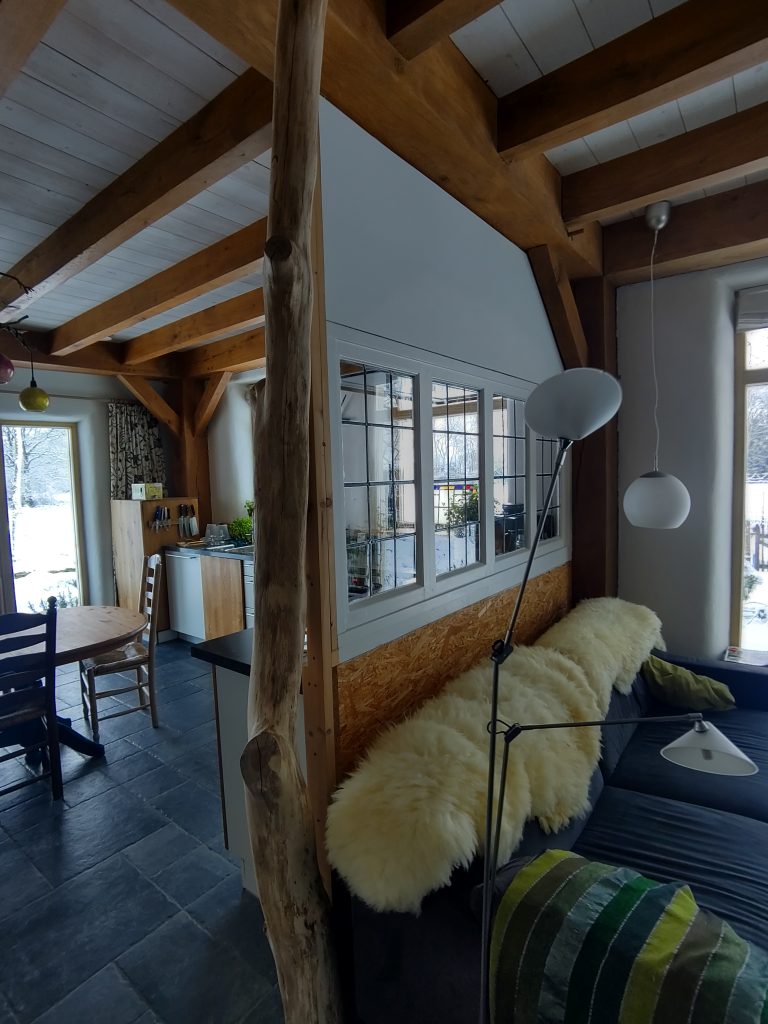 Aftimmeren van het schuine dak volgt nog. Net als de knieschotten en schuifdeurtjes. En de boekenplanken in de studeerkamer. En de leem op de muren.