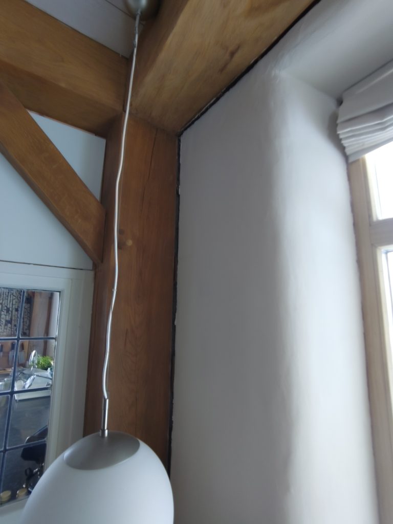 En bovendien ging de kopse gevel van het huis erg werken. Tussen de staanders van het gebint en de gevel ontstond een enorme spleet, waardoor ook een stuk van de leemlaag afbrokkelde. Daarvoor wil ik ook nog een keer de stukadoorsspaan ter hand nemen.