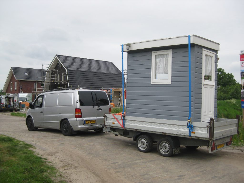 Dat was een gedenkwaardige dag… Heel vroeg op, aanhanger voor het klompenhok gehuurd in de Noordoostpolder. (Uiteraard was de aanhanger die we hadden gehuurd er per ongeluk toch niet,etc. etc.) Op naar Heerenveen, waar de verkoopster de caravan al ‘transportklaar’ had gemaakt. De transportfirma die we in de arm hadden genomen tilde het klompenhokje op de aanhanger, die werd achter de bus gekoppeld en wij gingen op weg naar De Hoeve (over de kleine weggetjes, want met dat gevaarte durfden we niet over de snelweg).