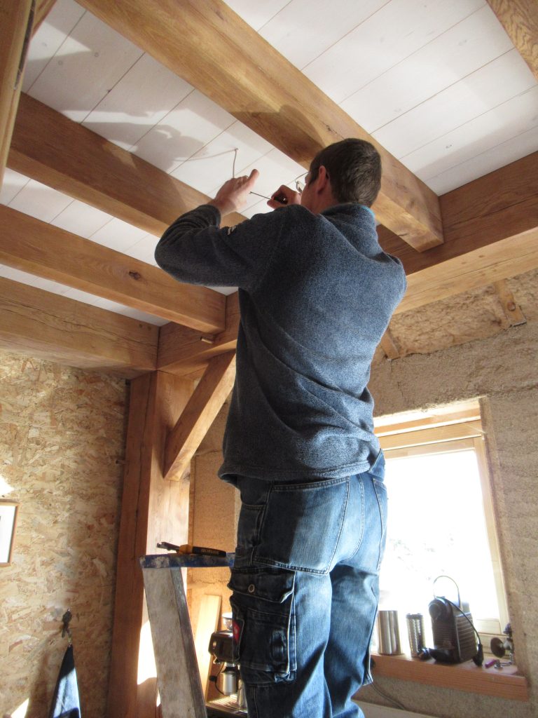 Nu werd ons verteld dat de kalk in de muren eerst 2 jaar moet ‘carbonatiseren’, vóór je er leemstuc op mag zetten. (Zo niet, dan heb je kans dat je ‘kalkuitbloei’ op de leemstuc krijgt). We hebben dus braaf twee jaar gewacht. Dat betekent dat we dit jaar kunnen gaan stuken. `Héél veel werk om in je eentje te doen. Omdat we met zoveel plezier terugkijken op de kalkhennepweek lijkt het ons leuk om dit jaar ook een ‘stucweek’ te organiseren. Opnieuw onder begeleiding van een vakman, in dit geval Geert de Bock van de Leemshop. Van hem heb ik ook leren stuken toen we met de werkplaats bezig waren.