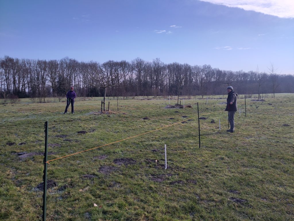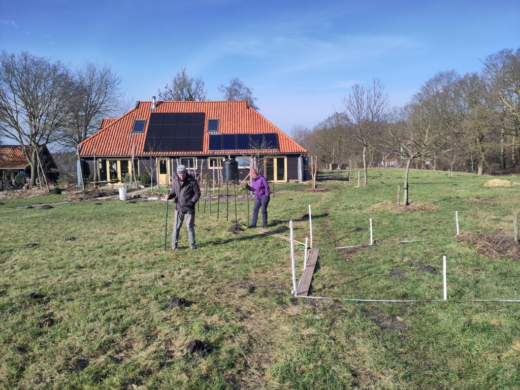 De moestuin moet dus naar een nieuwe plek. Maar ik ben er nog niet helemaal uit waar. Op 14 februari hebben Wyke en Edwin geholpen om mogelijke lijnen uit te zetten voor de moestuin en de passieve solar kas, die ook nog in de planning zit. Een hele dag stoeien met meetlinten, een kompas, touwtjes en witte steekpaaltjes. Dat heeft al een heleboel duidelijkheid opgeleverd over wat ik NIET wil, maar nog niet 100% hoe het WEL moet worden. In ieder geval is duidelijk geworden dat de pas aangelegde fruit-tuin waarschijnlijk weer plaats moet maken…