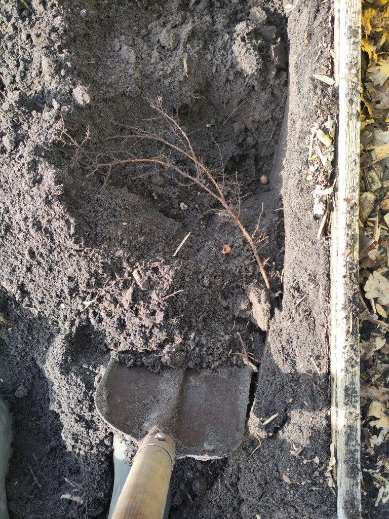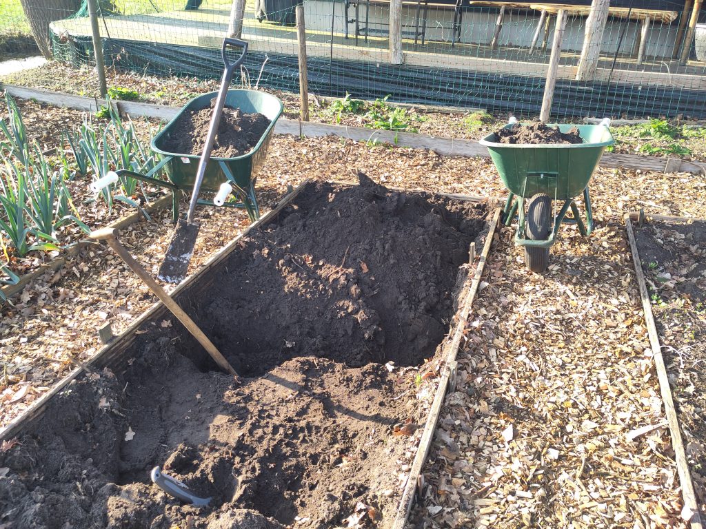 Maar in voorbereiding op het komend moestuinseizoen ben ik, als tussentijdse maatregel, de moestuinbedden één voor één drie steken diep aan het doorspitten. Heel ‘old school’: eerst de bovenste laag eraf, en ergens anders neerleggen. Dan van de volgende laag (de volgende ‘steek’) ook één rij schopsteken eraf, en dan dááronder de grond losmaken. En zorgvuldig alle boomwortels die ik tegenkom doorsteken of doorzagen. Vervolgens de grond van de volgende rij er weer op. Als het bed klaar is, komt de bouwvoor van het volgende bed er weer bovenop. En waar dat nodig is komen er nog een paar kruiwagens mest door het bed.